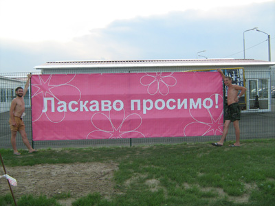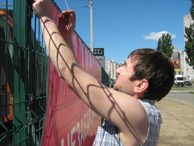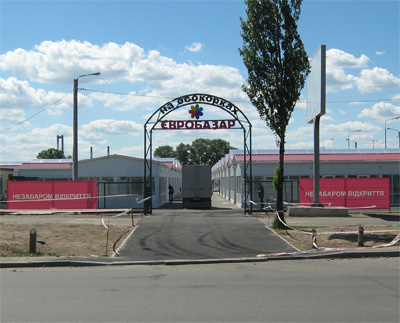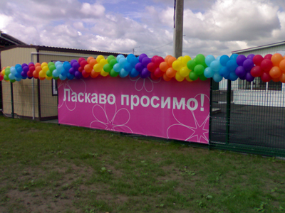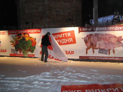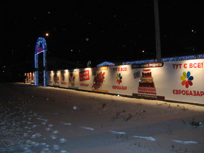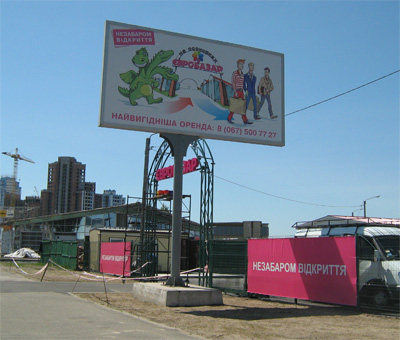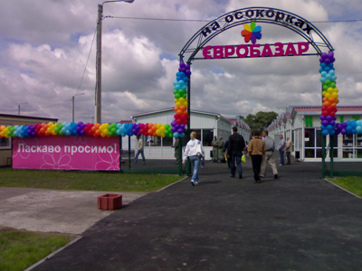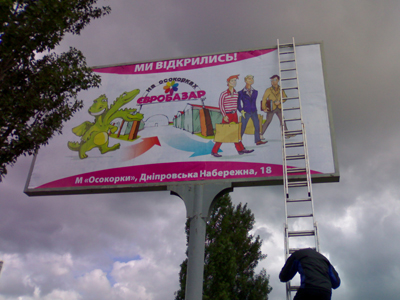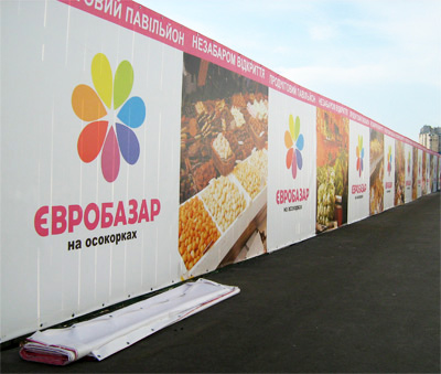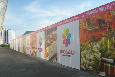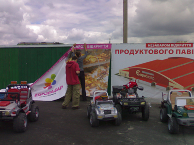 Комплексное оформление рынка наружной рекламой. Рынок "Евробазар на Осокорках". Открытие "Евробазара", монтаж баннеров: