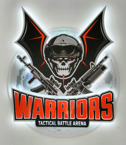 Брендирование спортивного стрелкового клуба “Warriors”. Изготовление интерьерного логотипа с контр ажурной подсветкой: