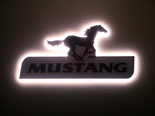 Изготовление вывески с контражурным свечением. Интерьерный логотип для ТМ "MUSTANG".