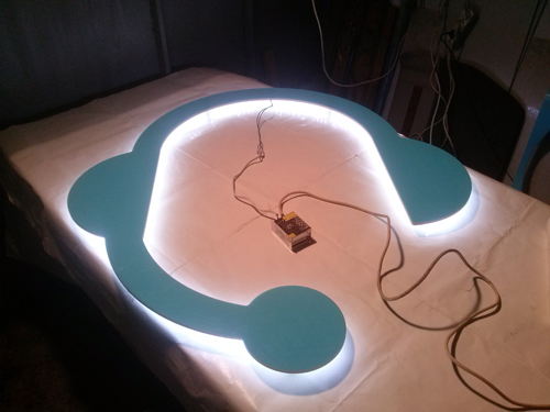 Изготовление интерьерного логотипа с контражурным свечением. Монтаж на нестандартную поверхность.